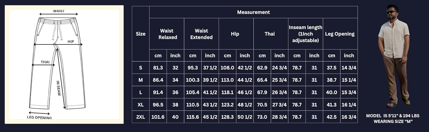 Blended Linen Fabric: These pants are meticulously crafted from a premium blend of linen and viscose. The result? A fabric that’s breathable, soft, and perfect for warm weather. These pants offer a loose fit cut that allows you to move freely. Perfect for jogging, yoga, or simply lounging at home.